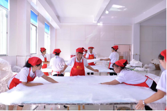 走进盖州市金马绢纺有限责任公司的蚕丝胎车间,工人们指尖翻飞,将蚕丝层层铺展成均匀蓬松的丝网。从原料除杂、洗练、烘干、检验,到后期裁剪、缝制、绗缝,每一道工序都经过严苛把控,步步夯实着企业的品质根基。