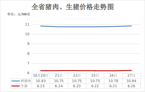 一、猪肉价格微幅回升。随着猪价跌至低位,养殖户普遍产生压栏惜售情绪,部分养殖户看好后市,二次育肥积极性提高;同时全国范围内气温下降,尤其是北方地区,居民猪肉消费需求有所增加,本周生猪、猪肉价格先降后涨。10月27日,生猪(每500克,下同)平均价格6.26元,周环比上涨0.48%,同比下降29.27%;猪肉(去骨后腿肉)10.84元,周环比上涨0.09%,同比下降20.47%。据国家对36个大中城市监测,猪肉(精瘦肉)平均价格15.14元,周环比下降0.72%,同比下降14.56%。