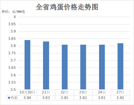 二、鸡蛋价格微幅下降。目前鸡蛋市场供应整体充足,虽然消费终端需求小幅增长,但仍未能抵过供应压力带来的利空,本周鸡蛋价格窄幅调整。10月27日,鸡蛋价格3.82元,周环比下降0.52%,同比下降28.06%。据国家对36个大中城市监测,鸡蛋平均价格4.64元,周环比下降0.64%,同比下降20.14%。
