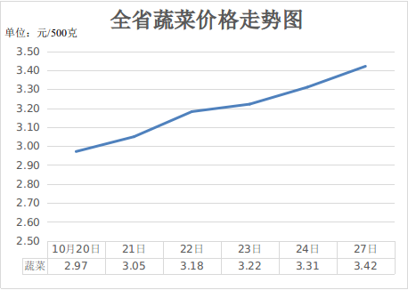 三、蔬菜价格季节性上涨。随着气温下降,蔬菜生产开始以温室生产为主,整体上货量少,加之秋冬季保温、储运成本提高,蔬菜价格整体以涨为主。10月27日,重点监测的16种蔬菜平均价格为3.42元,周环比上涨15.15%,同比上涨7.17%。据国家对36个大中城市监测,15种蔬菜平均价格为3.95元,周环比上涨4.6%,同比下降3.58%。