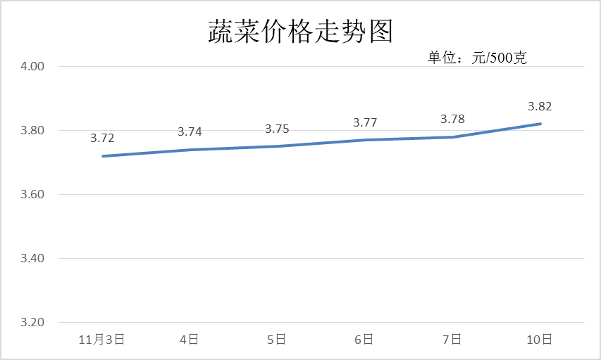 三、蔬菜价格稳步上行。进入11月后气温逐步下降,露地蔬菜上市量有所减少,部分产区蔬菜采收、运输成本略有增加,推动价格小幅上涨。同时,居民对蔬菜的消费需求回暖,对价格形成支撑。11月10日,重点监测的16种蔬菜平均价格为3.82元,周环比上涨2.69%,同比上涨26.07%。据国家对36个大中城市监测,15种蔬菜平均价格为4.23元,周环比上涨2.17%,同比上涨8.46%。