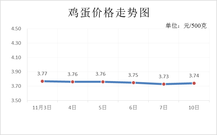 二、鸡蛋价格温和下行。目前蛋鸡存栏相对高位,且近期产蛋量进入旺季,鸡蛋日供应量充足,市场货源稳定,同时,终端消费以刚需为主,对价格支撑力较弱。11月10日,鸡蛋价格3.74元,周环比下降0.80%,同比下降28.49%。据国家对36个大中城市监测,鸡蛋平均价格4.59元,周环比下降0.43%,同比下降20.17%。