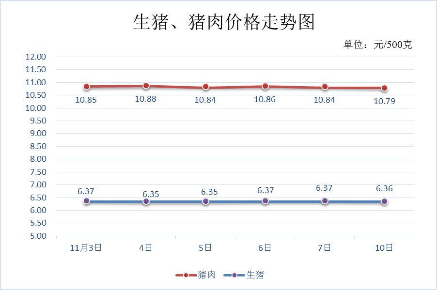 一、猪肉价格小幅波动。当前生猪存栏仍处于高位,市场供应充足但未出现集中出栏的情况,供给节奏相对稳定。同时,目前处于节后消费淡季与冬季消费旺季的过度阶段,终端需求较为平稳,对价格的拉动作用不明显。11月10日,生猪(每500克,下同)平均价格6.36元,周环比下降0.16%,同比下降25.87%;猪肉(去骨后腿肉)10.79元,周环比下降0.55%,同比下降19.96%。据国家对36个大中城市监测,猪肉(精瘦肉)平均价格15.18元,周环比持平,同比下降13.16%。
